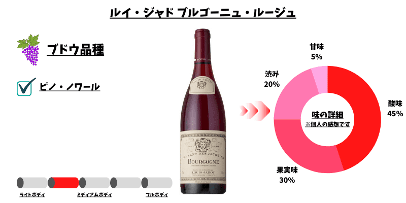 | ルイ・ジャド・ブルゴーニュ・ルージュ | 赤ワイン | ブルゴーニュ | ピノ・ノワール | 2,497円~ | ★★★★ |